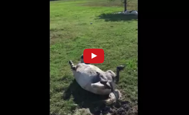 Kerens, Texas resident, Kelley Palma, explains her peculiar pony’s hilarious habit of convincingly playing dead: “Almost weekly people stop or call to tell me my pony is dead. In this particular incident, some contractors called me to tell me the same. I told them that “he just plays possum’, and one of them said “No, he’s dead, his leg is stiff”. The first time Pinto did this a few years ago, I called my adult children to inform them that my grandkid’s pony was dead. I was headed to load him on a front-end loader to take him to the back pasture to allow nature to take it’s toll. When I got close to him, he got up and ran! He’s been doing this ever since.”