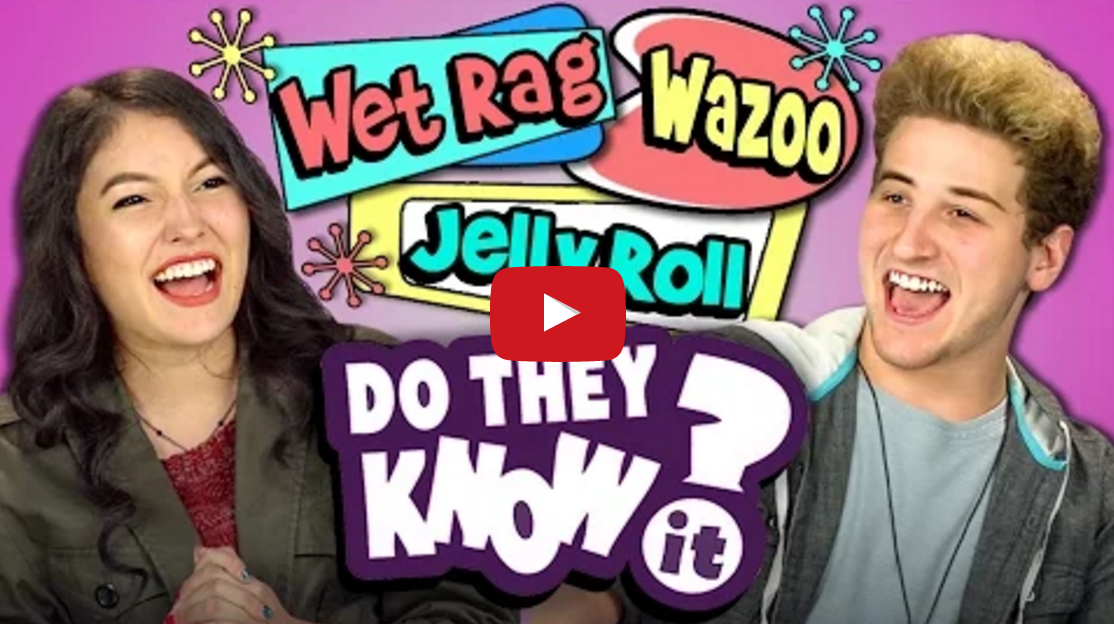In the latest edition of their “Do They Know It?” series, The Fine Brothers, Benny and Rafi, ask a group of teenagers if they understand the meanings of popular 1950s slang words, including wet rag, backseat bingo, nosebleed, and razz my berries.