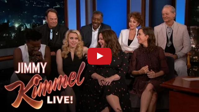 In this clip from last night’s episode of Jimmy Kimmel Live, original cast members from Ghostbusters 1 and 2, Dan Aykroyd, Bill Murray, Ernie Hudson, and Annie Potts, are joined onstage by the cast of the upcoming Ghostbusters reboot, Kristen Wiig, Melissa McCarthy, Kate McKinnon, and Leslie Jones.