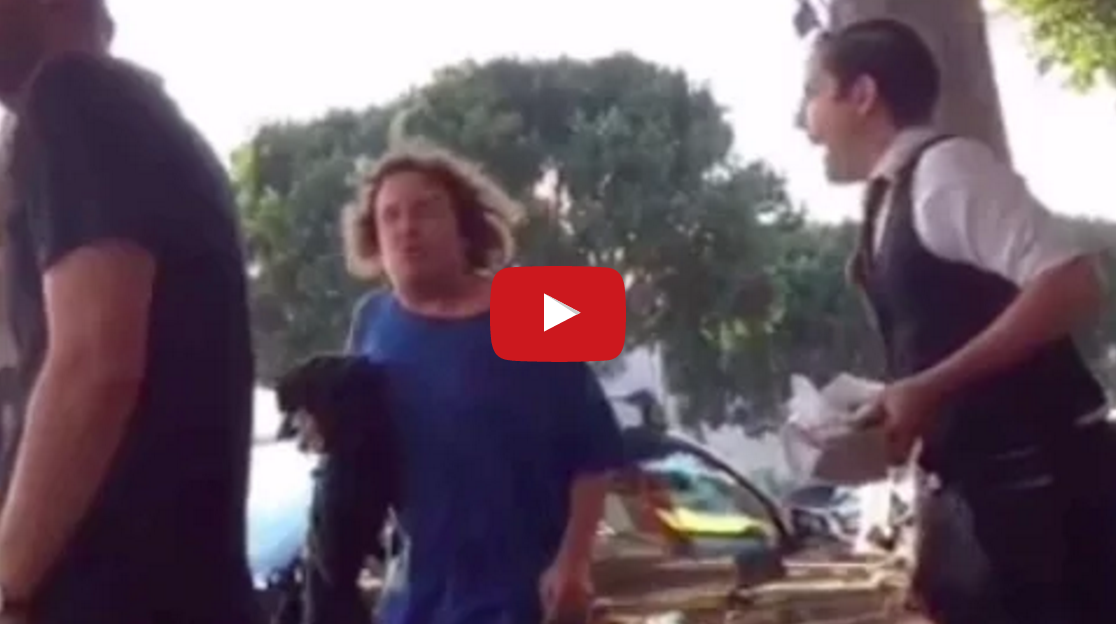 In this odd video filmed by bam21, an eccentric guy known as “Evil Elmo,” who has a habit of yelling anti-Semitic and conspiratorial rants at restaurant goers in the Los Feliz neighborhood of Los Angeles, gets hilariously shut down when a waiter decides to fight crazy with crazy by making loud monkey noises at him.