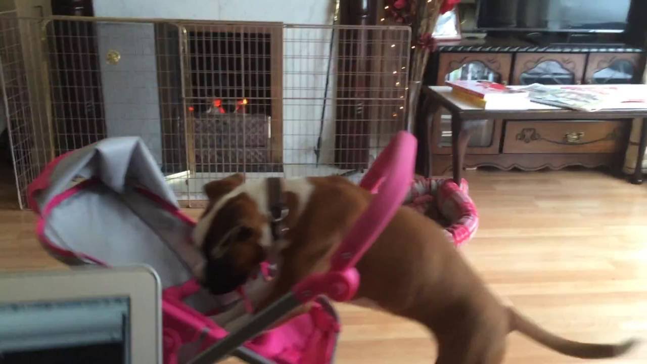 David McGinn‘s mischievous boxer puppy, Skye, decided to entertain himself by maneuvering a doll’s baby stroller all around the house.