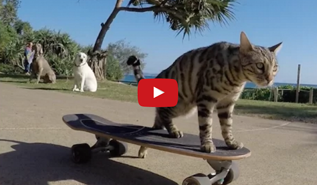 Australian dog and cat trainer, Robert Dollwet, has trained his multi-talented Bengal cat, Boomer, to use his hind paw to push a skateboard all by himself.