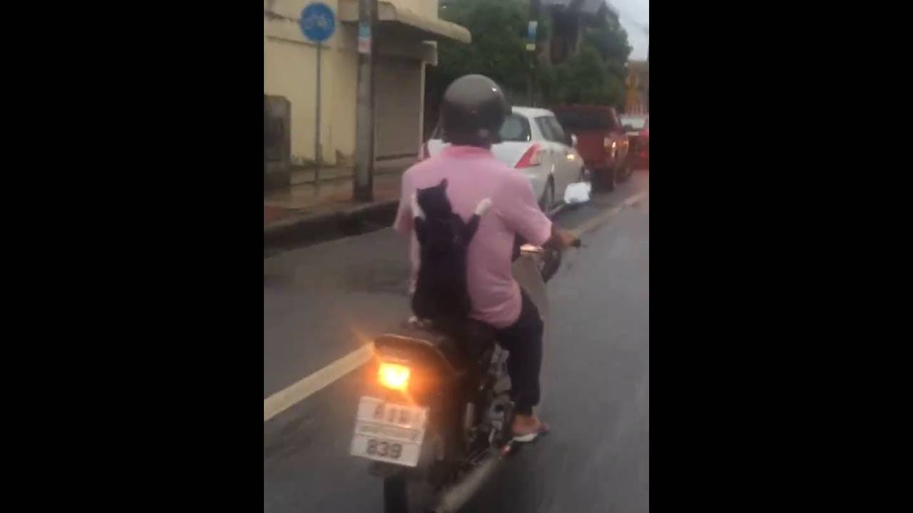 Cat Spotted Riding on Back of Scooter in Thailand ByTastefully Offensive July 18, 2016 A driver from Nakhon Si Thammarat, Thailand filmed this unusual video of a cat calmly riding on the back of his human’s scooter, like a little person.