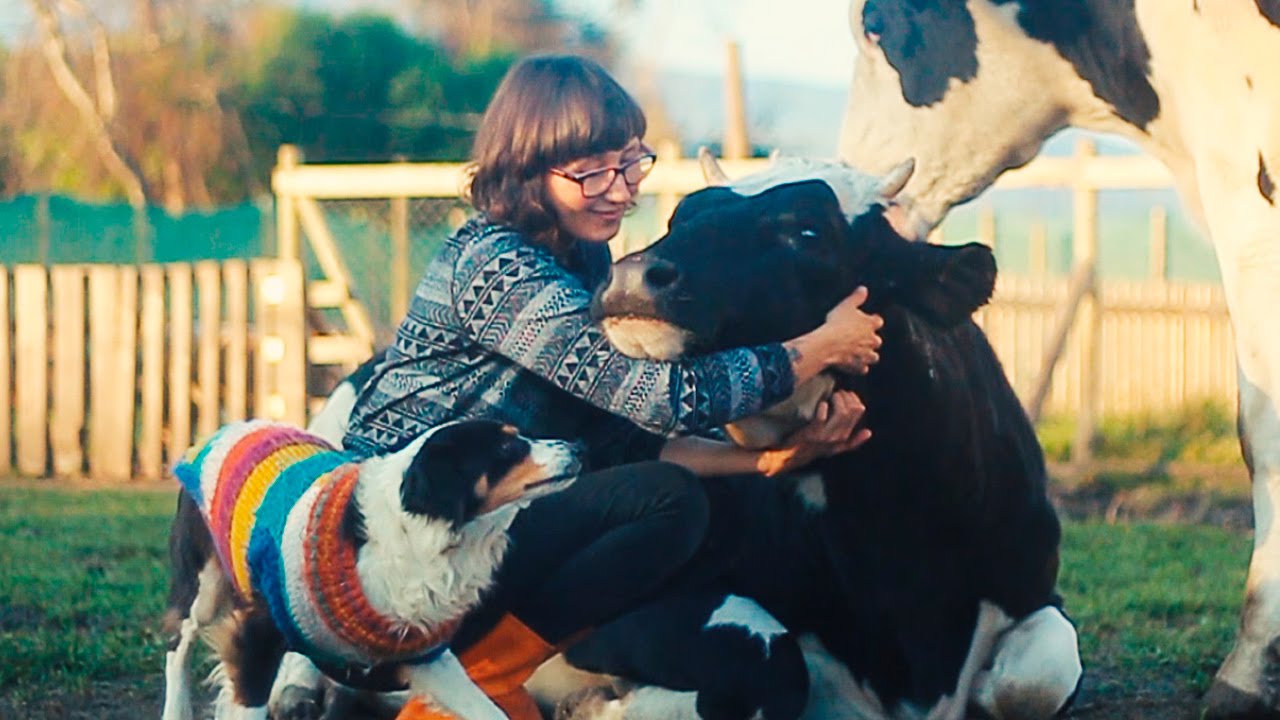 In this cute video from the Igualdad Interespecie animal sanctuary in El Monte, Chile, a jealous dog wearing a colorful sweater backs in for some butt scratches while his human is giving Hope, the cow, a head massage.