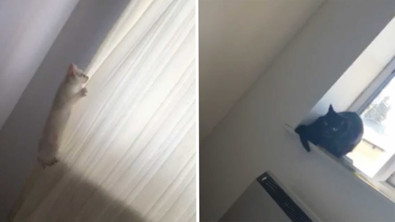 Kitten Makes Adult Cat ‘Magically’ Appear ByTastefully Offensive July 6, 2016 Mischievous Leo, the 11-week-old kitten, appears to magically reveal a big black cat (two-year-old Raven) after clumsily ripping down a set of curtains.