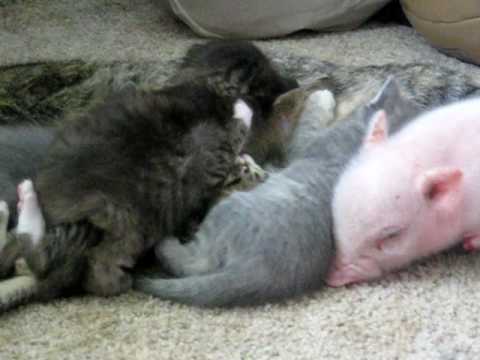 Pot-bellied Piglet Thinks He’s a Kitten ByTastefully Offensive July 11, 2016 Stuart, the 4-week-old teacup pot-bellied piglet, cozies up with a mother cat and her litter of 4-week-old kittens like he’s part of the family.