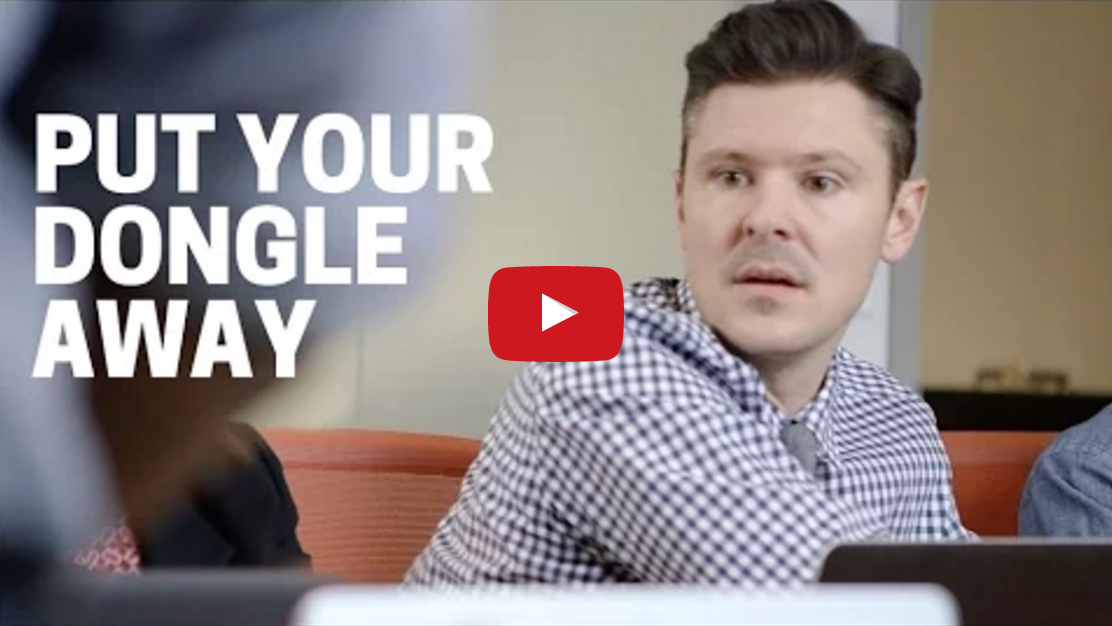 In this funny promotion for Zoom Rooms from comedy duo Tripp & Tyler (Tripp Crosby and Tyler Stanton), co-workers in an office meeting get carried away with dongle-related innuendos.