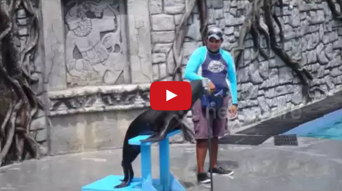 This talented seal lion hilariously “sings” Gnarls Barkley’s 2006 hit “Crazy” into a microphone at the Dolphin Discovery attraction in Cozumel, Mexico’s Chankanaab National Reef Park.