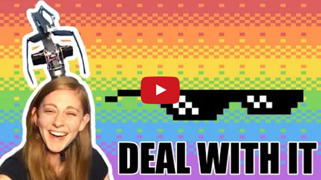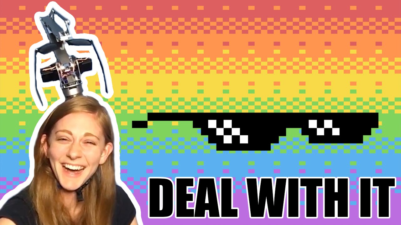 Swedish inventor Simone Giertz, aka “The Queen of Sh*tty Robots,” debuts and demonstrates her latest creation, a real-life version of the classic “Deal With It” Intermet meme.