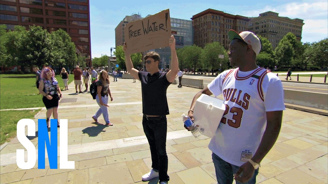 While covering the 2016 Democratic National Convention, Saturday Night Live‘s “Weekend Update” co-anchors, Colin Jost and Michael Che, hit the streets of Pittsburgh, Pennsylvania see how Hillary Clinton supporters react to receiving free bottles of Donald Trump branded-water.