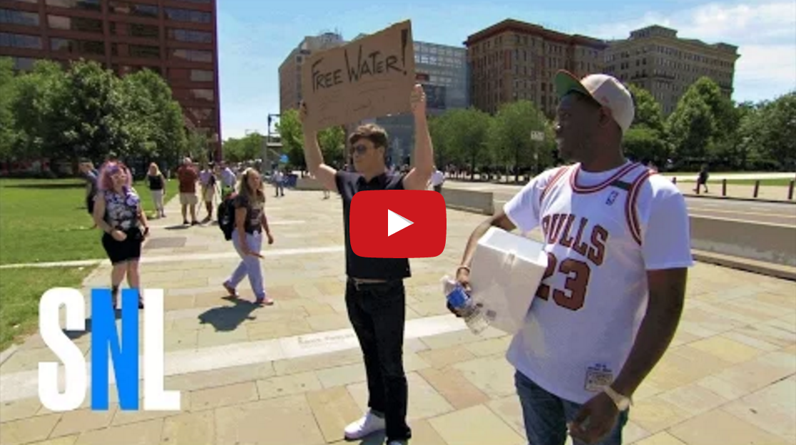 While covering the 2016 Democratic National Convention, Saturday Night Live‘s “Weekend Update” co-anchors, Colin Jost and Michael Che, hit the streets of Pittsburgh, Pennsylvania see how Hillary Clinton supporters react to receiving free bottles of Donald Trump branded-water.