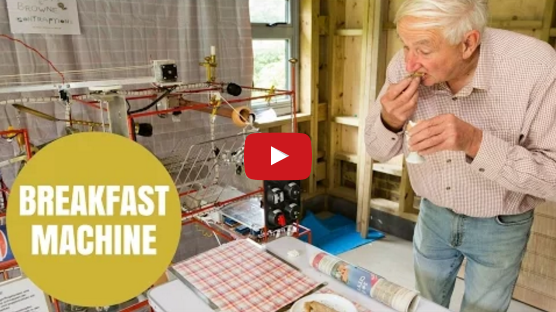 69-year-old retired airline pilot and silversmith, Peter Browne, spent 1,000 hours building this Wallace and Gromit-style “Sunday Morning Breakfast Machine” with his pal Mervyn Huggett. The amusing contraption is capable of serving up soft-boiled eggs, toast, tea and coffee, and even presents the morning newspaper.