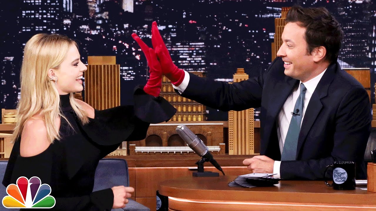 Australian actress and Suicide Squad star Margot Robbie and Tonight Show host Jimmy Fallon play the new Tonight Show game, “Jinx Challenge,” where they draw random categories and attempt to shout out the same words at the same time (while wearing a weird glove for some reason).