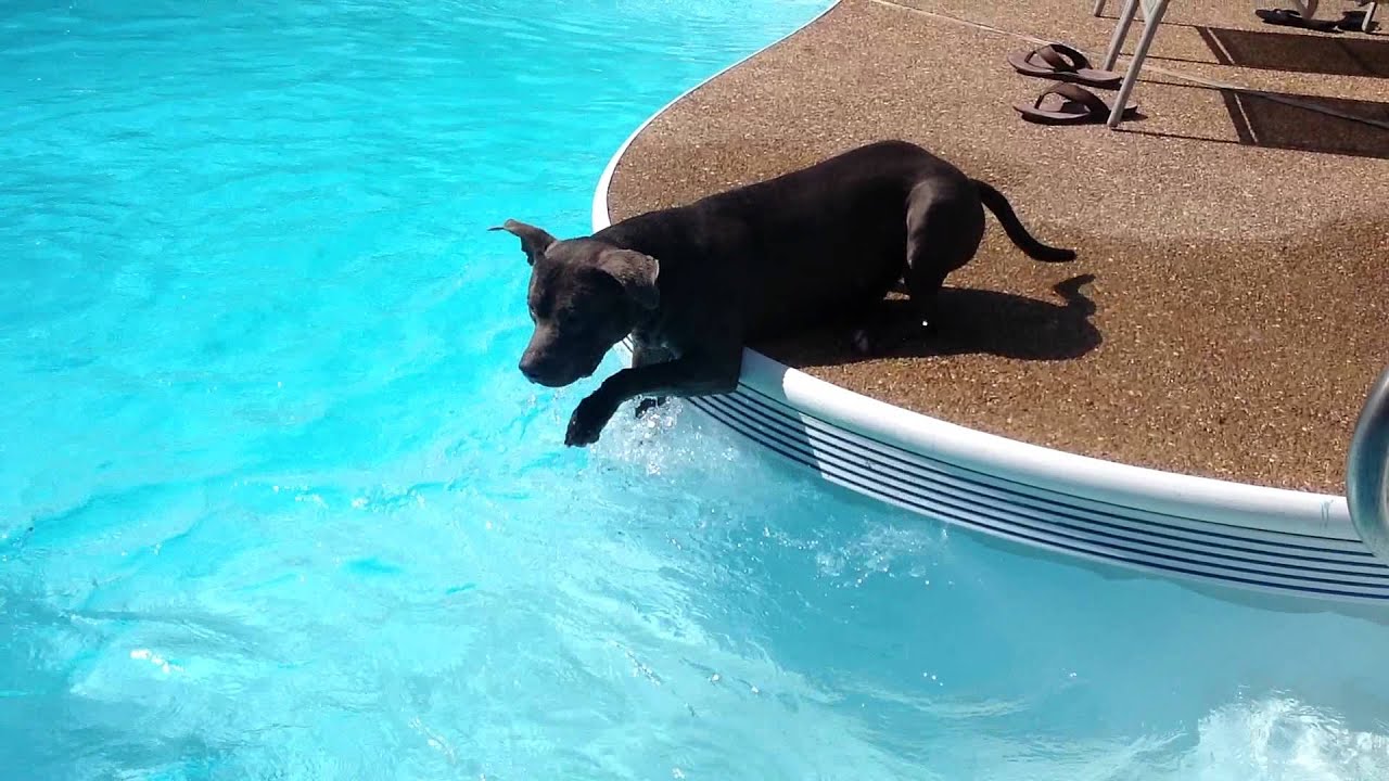 After seeing a swimming pool for the first time, this cute pit bull from Chicago needed to perform a few practice doggy paddles before diving in.