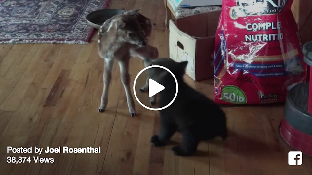 Biologist Joel Rosenthal from Point of View Farm wildlife sanctuary in Hillsboro, West Virginia filmed this adorable video of Boog, a rescued five-month-old black bear cub cautiously getting acquainted with a rescued fawn.