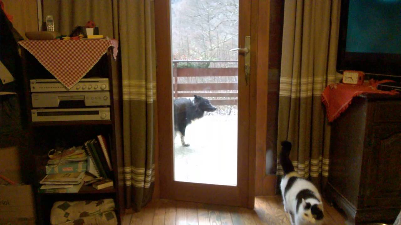 This super smart border collie, named Riki, has learned how to open and close doors, which is helpful when her feline housemate wants back inside the house.