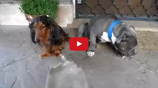 When confronted by his human, Daniel Martino, about eating a shoe, this adorably remorseful Staffordshire bull terrier attempts to hide behind his fabulously-haired weiner dog pal.