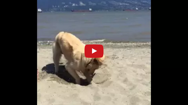 In this short clip, Easton, the golden retriever, enthusiastically dives back into digging a hole, after taking a short break, while spending a day at a beach with his humans in Ontario, Canada.