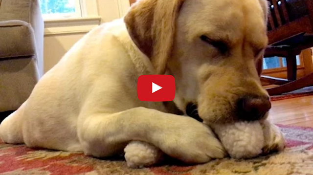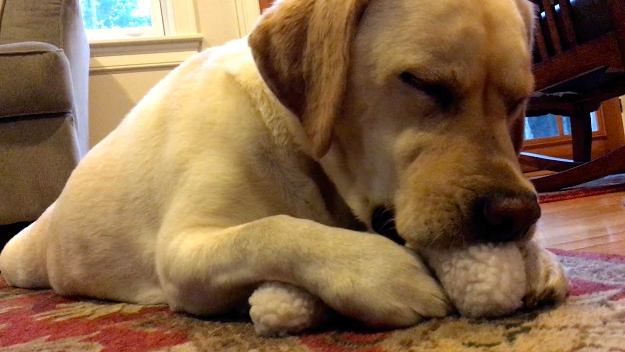 Stella, the 3-year-old yellow labrador retriever, loves her fuzzy bone toy so much she often falls into a joy induced slumber while in the middle of playing with it.