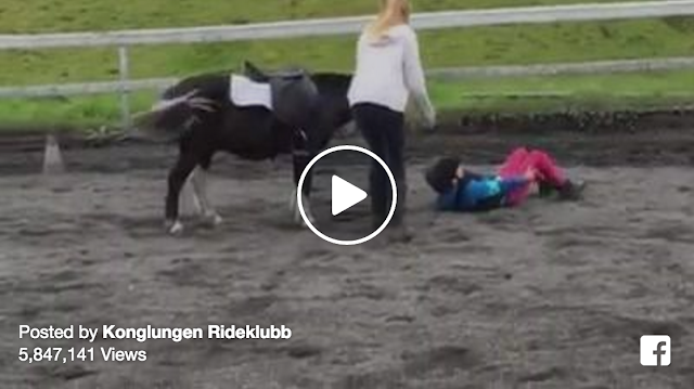This little Norwegian girl hilariously falls on her head while riding a gentle pony at the Konglungen Riding Club in Vettre, Norway.
