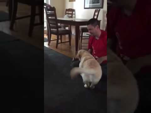 When his human “dad” gets home from work, this adorable stubby-legged corgi/yellow lab mix plops down on his lap and insists on staying there.