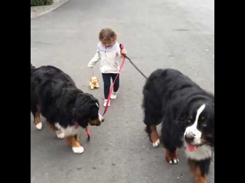 In this short but cute clip, a little girl named Ruby brings her toy dog, Blue, along while taking her canine siblings, Biggie and Wooster, the Bernese mountain dogs, for a walk.