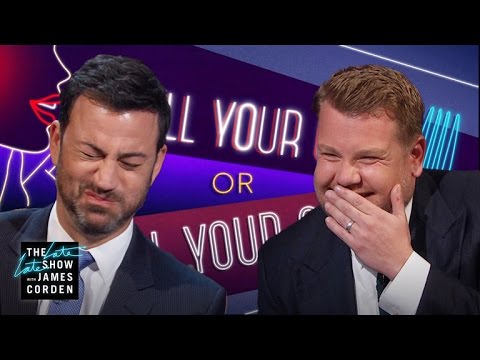 Late night hosts Jimmy Kimmel and James Corden play the Late Late Show game “Spill Your Guts or Fill Your Guts” where they must choose to truthfully answer a tough question or eat a disgusting food item, like ghost pepper hot sauce, fish smoothie, and bull penis.