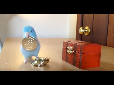 Charlie, the clever pacific parrotlet, gets rewarded with sesame seeds for filling his minature treasure chest bank with gold coins.