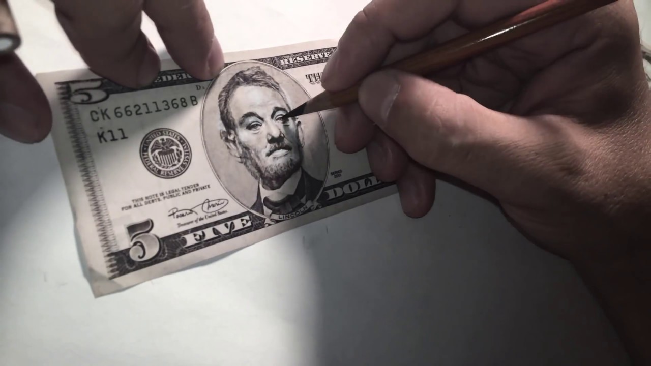 In this amazing time-lapse video, Matt Anderson (aka Ginozko), a talented, self-taught artist from Los Angeles, uses black and white charcoal pencils to turn Abraham Lincoln’s portait on a five-dollar bill into a bearded Bill Murray.