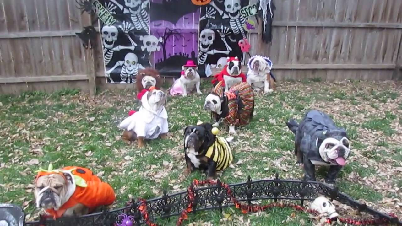 Macnaughty Bulldogs shared this cute video of their nine lovable bulldogs showing off their new Halloween costumes while posing for this year’s Halloween photo.