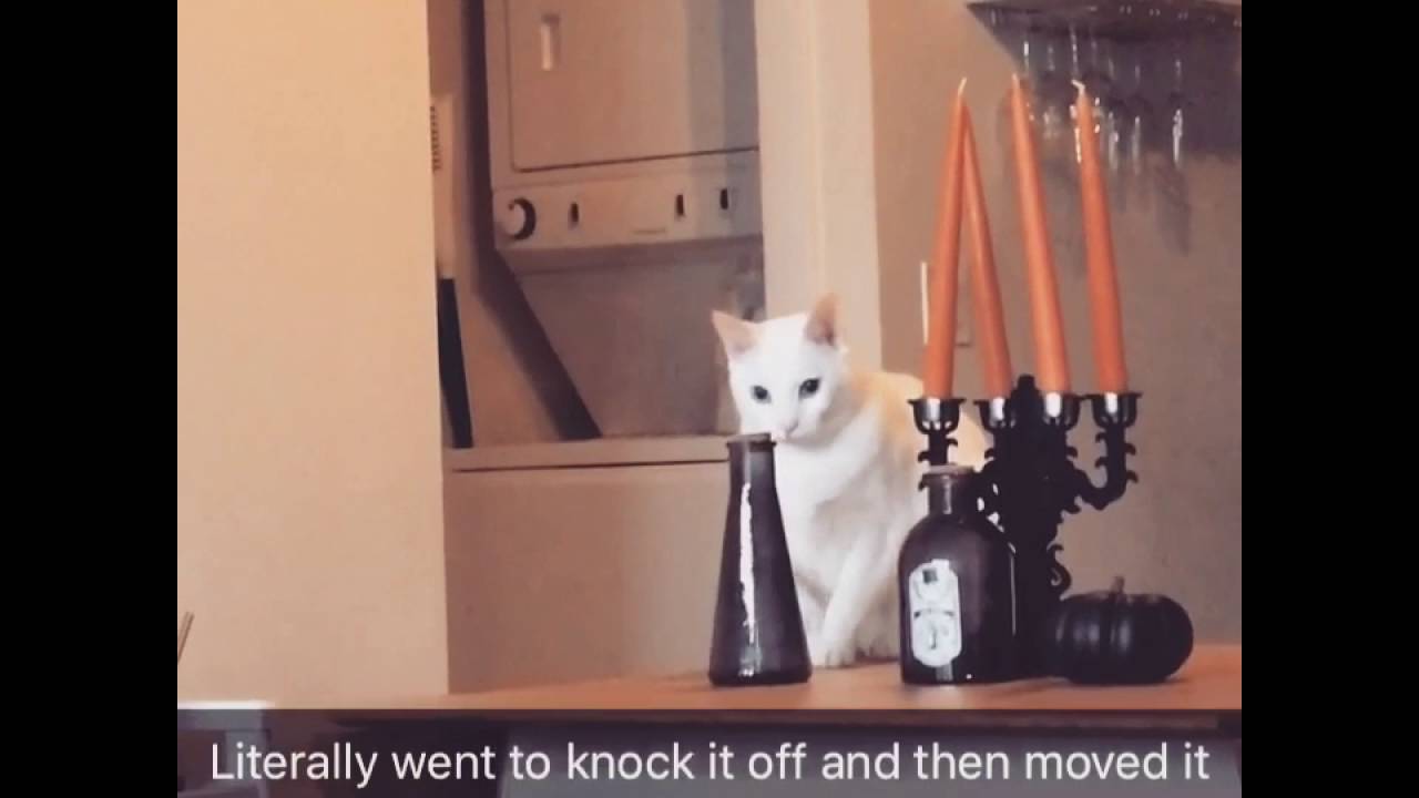 In this short, soundless clip, a mischievous cat appears to move a bottle back to its original spot when his human catches him in the process of pushing it off the table.