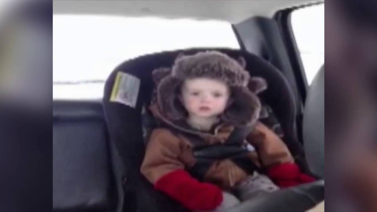 While struggling to stay awake during a road trip, this cute, bundled up toddler quickly takes his dad’s advice to get some sleep.