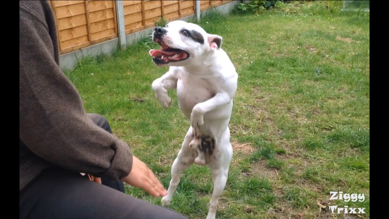 Ziggy Trixx, the skateboarding Staffordshire Bull Terrier from Sussex, England, can’t help but dance when his human plays his favorite jam on a cajón drum.