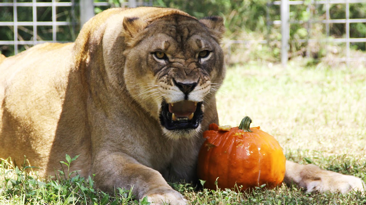Rescued Lions and Tigers Celebrate Halloween with Pumpkins and Haunted Houses