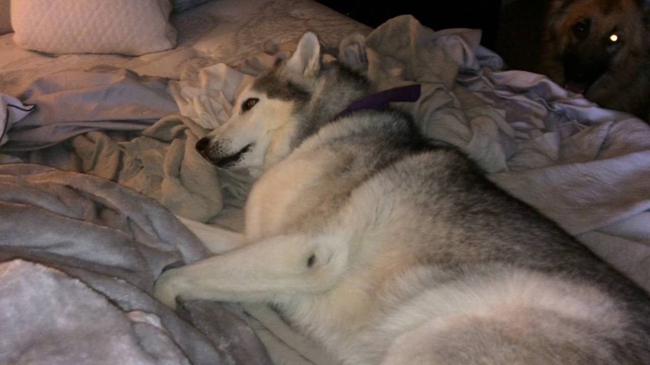 Zeus, the Siberian husky dog, who’s famous for his temper tantrums over baths, throws another toddler-like fit when his patient human, Lindsay Fleishman, tells him it’s time to get out of bed.