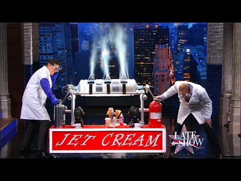 During last night’s epiode of The Late Show, celebrity chef Alton Brown stopped by to show off his “Jet Cream” invention, that creates a gallon of carbonated ice cream in just ten seconds.