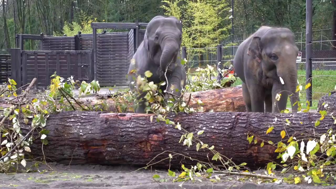 The Oregon Zoo‘s asian elephant family were excited to receive a donation of several 30-feet long logs to push against, climb over, and scratch on.