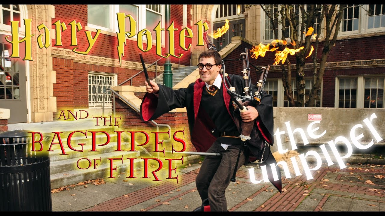 In his latest video, Portland, Oregon-based musician Brian Kidd, aka “The Unipiper,” chases a giant snitch dressed as Harry Potter, while performing the Harry Potter theme song on his famous flaming bagpipes, and riding a flying broomstick (electric mono scooter).