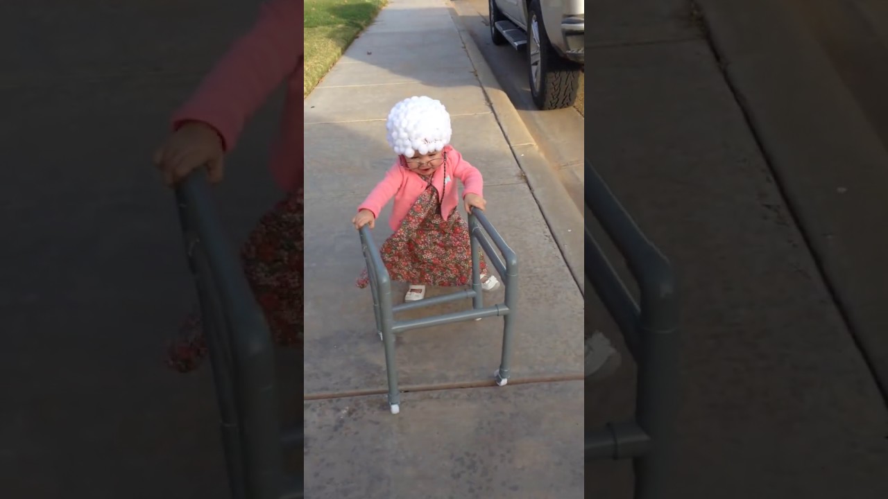 In this short but cute clip, a cute little girl takes a stroll down the sidewalk in her adorable “little old lady” Halloween costume, complete with a mini walker.