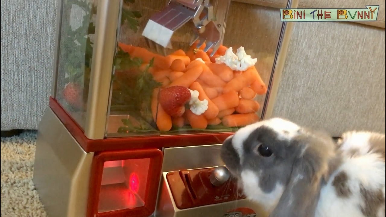 Bini, the famously clever Holland Lop rabbit, who’s known for playing basketball, giving makeovers, and painting masterpieces, quickly figures out how to play and conquer a mini arcade vending machine game that his human filled with healthy treats.