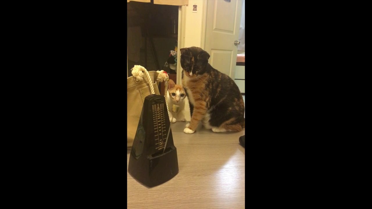 Hoi Ki Chan shared this amusing video of her cats, Leelo (calico) and Fox (orange and white), cautiously investigating a ticking metronome.