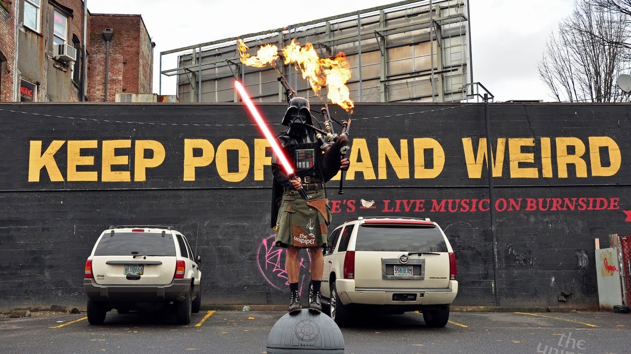 To celerbrate the upcoming release of Rogue One: A Star Wars Story, Portland, Oregon-based musician Brian Kidd, aka “The Unipiper,” dressed up as Darth Vader to perform iconic Star Wars music on his famous flaming bagpipes, while maintaining his balance on a Death Star yoga ball.