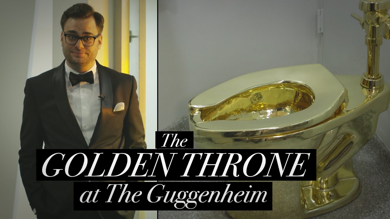 In the latest episode of Golden Thrones, a web series that travels the globe in search of cool and unusual bathrooms, host Jon DelCollo checks out Italian artist Maurizio Cattelan‘s fully functional 18k gold toilet at the Guggenheim Museum in New York City.