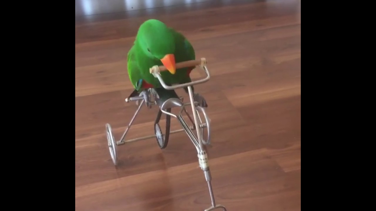 Happy, the clever 7-year-old electus parrot from Sydney, Australia, takes his custom mini bicycle for a spin. You can see more of Happy’s shenanigans on his Instagram page.