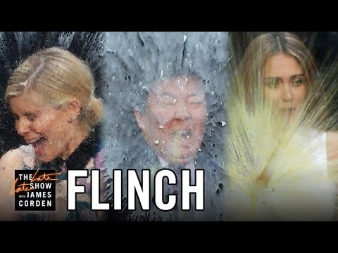 In this clip from The Late Late Show, actors Ken Jeong, Jessica Alba, and Kate Mara stand behind plexiglass and try their best to avoid flinching while host James Corden fires fruit at them with a high-powered cannon.