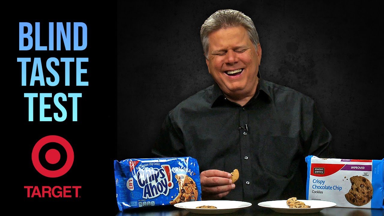 Tommy Edison, who has been blind since birth, tests whether he can determine the difference between Target’s less expensive “Market Pantry” store brand products and famous name brand products, including Nabisco’s Chips Ahoy chocolate chip cookies, Cheerios, Ritz peanut butter cracker sandwiches, and more.