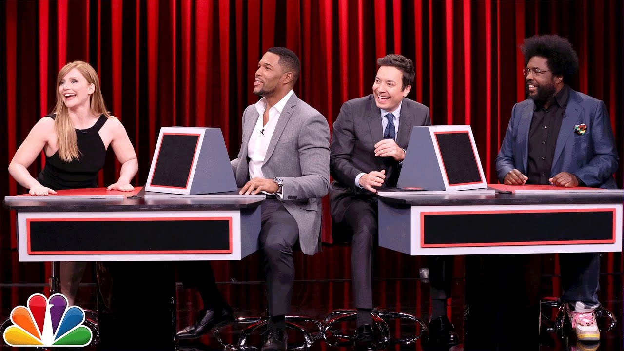 Tonight Show host Jimmy Fallon and Questlove from The Roots face off against actress Bryce Dallas Howard and former NFL football star and TV host Michael Strahan in a Tonight Show version of the classic TV game show, Pyramid.