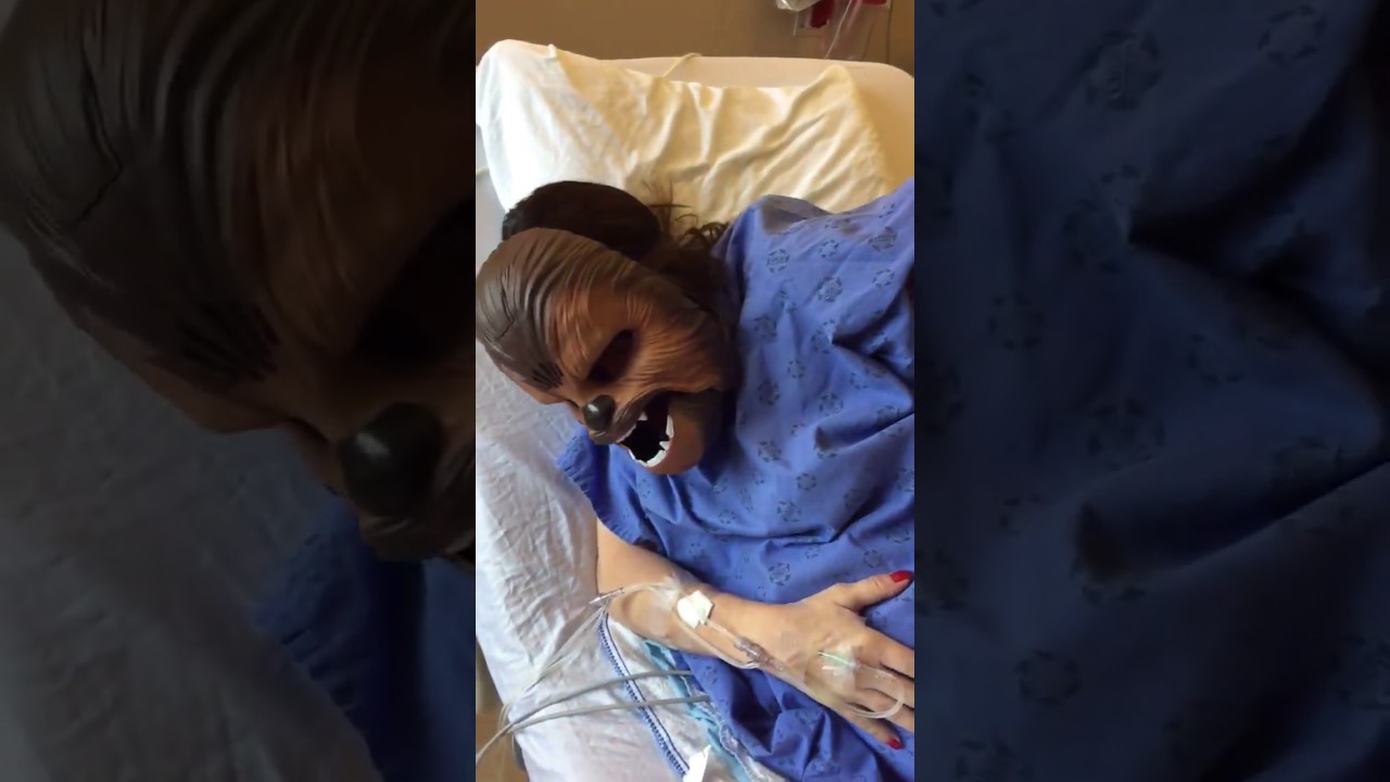 Katie Stricker Curtis from Detroit, Michigan has gained Internet attention for this silly video of her wearing an electronic Chewbacca mask (the mask made famous by Candace Payne, aka “Chewbacca Mom“) while going into labor at the hospital.