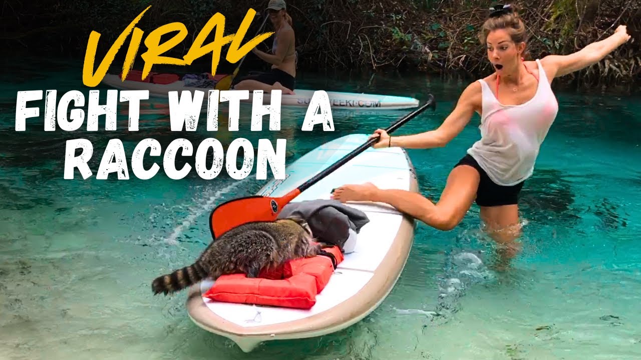 While on a stand up paddleboard tour at Weeki Wachee Springs in Florida, model Janna Breslin had to fight for her lunch and jacket when a cheeky wild raccoon caught a whiff of her food and tried to score himself a free meal.