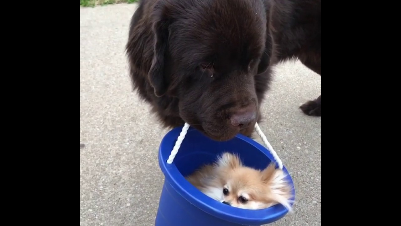 Boomer, the mighty Newfoundland, uses a bucket to carry around his fluffy Pomeranian pal, Lady, who seems to thoroughly enjoy the free ride. See more of these two on their Instagram page.